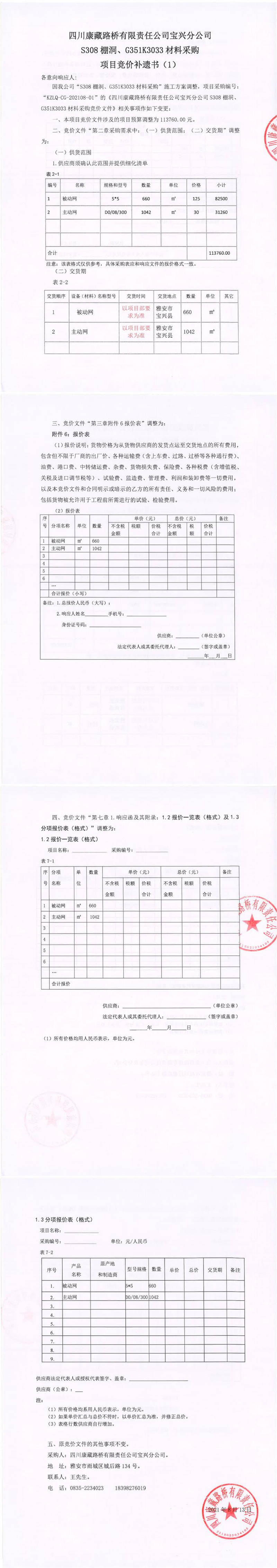四川康藏路橋有限責任公司寶興分公司S308棚洞、G351K3033材料采購項目競價補遺書(1)