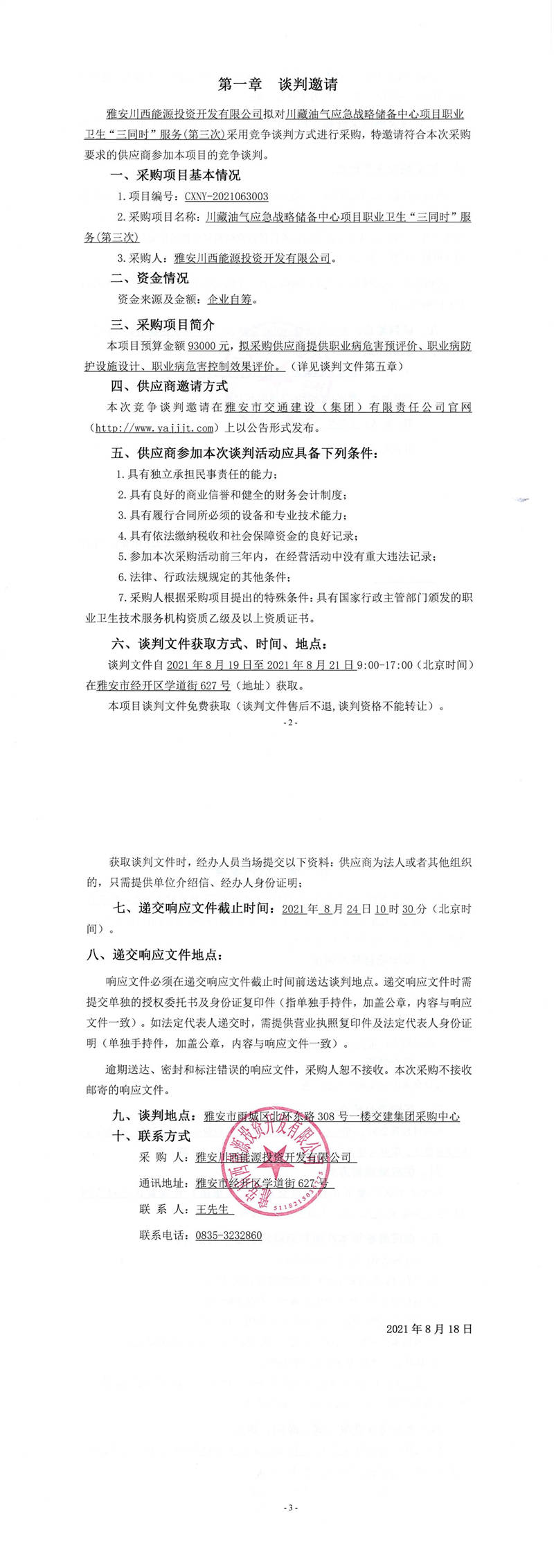 雅安川西能源投資開發(fā)有限公司川藏油氣應(yīng)急戰(zhàn)略儲(chǔ)備中心項(xiàng)目職業(yè)衛(wèi)生“三同時(shí)”服務(wù)(第三次)競(jìng)爭(zhēng)談判