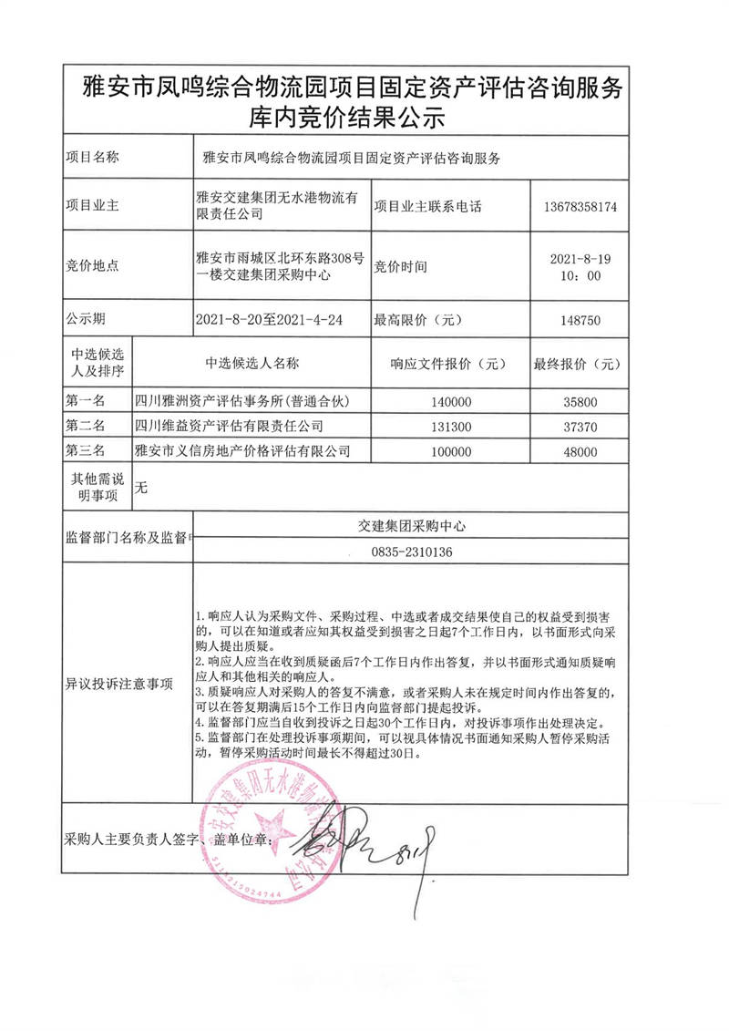 雅安交建集團無水港物流有限責任公司雅安市鳳鳴綜合物流園項目固定資產(chǎn)評估咨詢服務庫內(nèi)競價結(jié)果公示