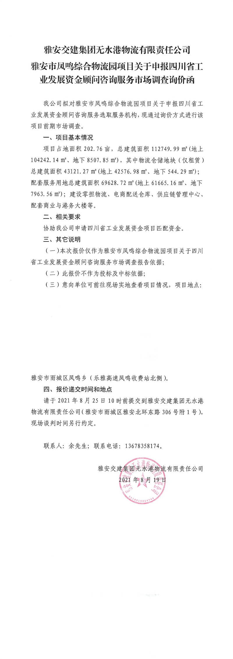 雅安交建集團(tuán)無(wú)水港物流有限責(zé)任公司雅安市鳳鳴綜合物流園項(xiàng)目關(guān)于申報(bào)四川省工業(yè)發(fā)展資金顧問咨詢服務(wù)市場(chǎng)調(diào)查詢價(jià)函