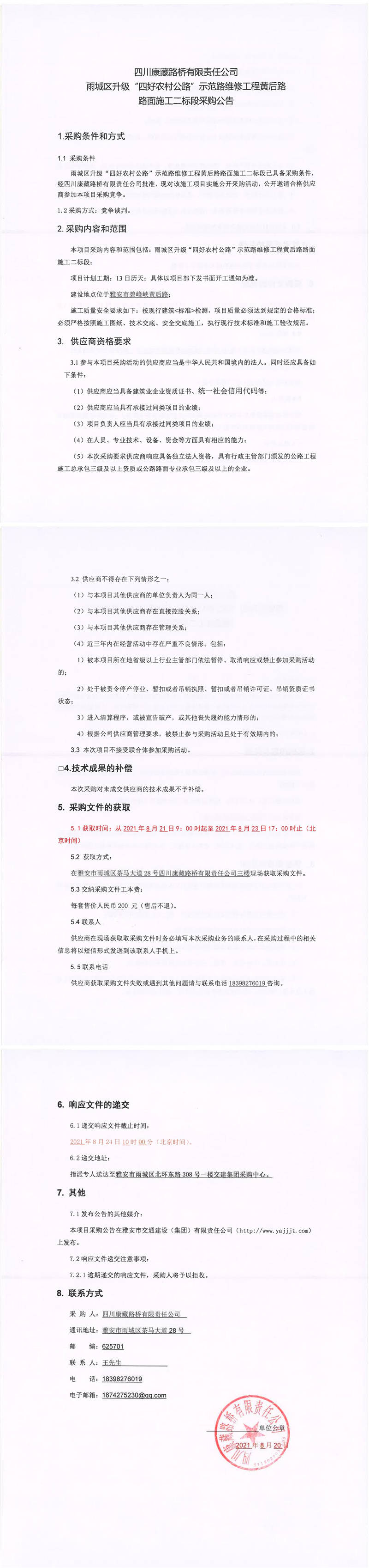 四川康藏路橋有限責任公司雨城區(qū)升級“四好農(nóng)村公路”示范路維修工程黃后路路面施工二標段采購公告
