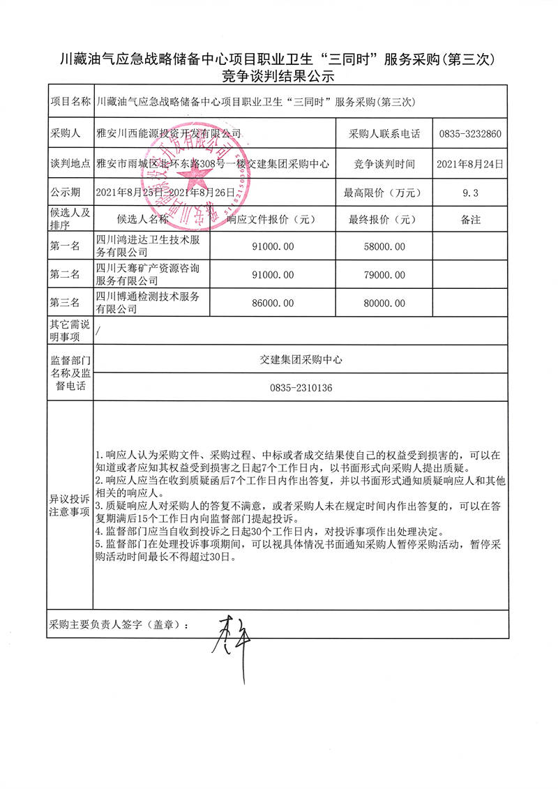 雅安川西能源投資開發(fā)有限公司川藏油氣應急戰(zhàn)略儲備中心項目職業(yè)衛(wèi)生“三同時”服務采購(第三次)競爭談判結果公示