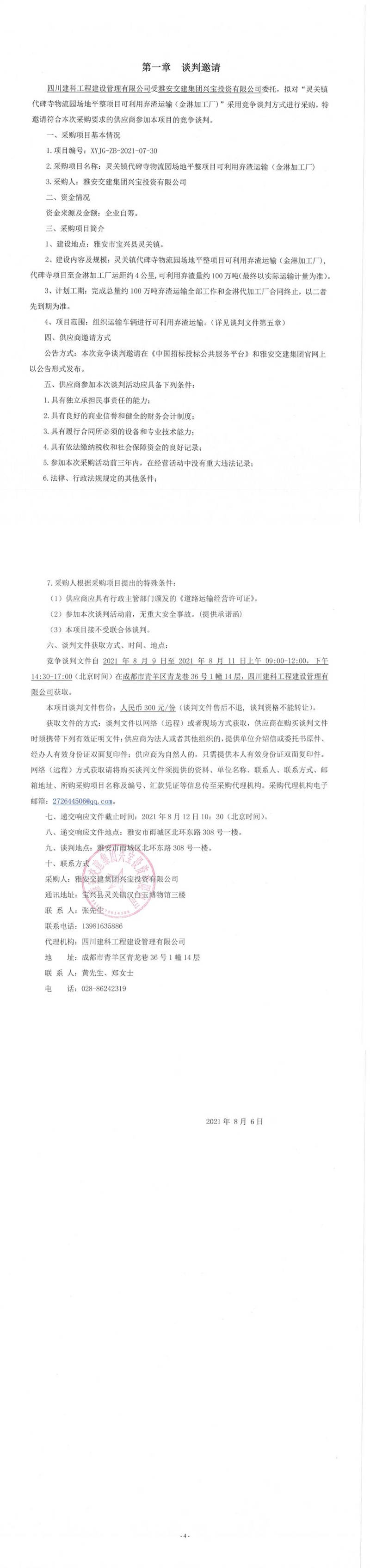 雅安交建集團興寶投資有限公司靈關鎮(zhèn)代碑寺物流園場地平整項目可利用棄渣運輸(金淋加工廠)競爭談判公告