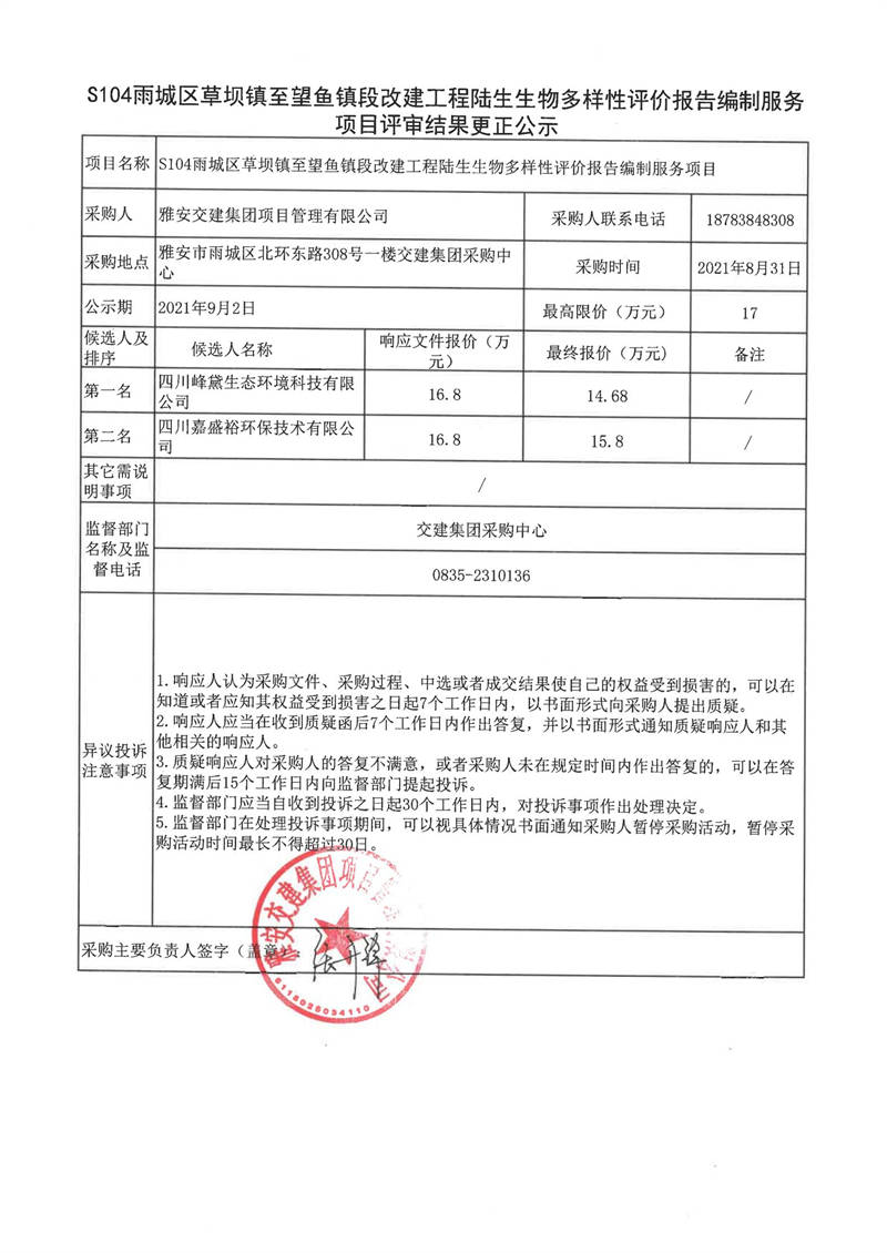 雅安交建集團(tuán)項目管理有限公司S104雨城區(qū)草壩鎮(zhèn)至望魚鎮(zhèn)段改建工程陸生生物多樣性評價報告編制服務(wù)項目評審結(jié)果更正公示