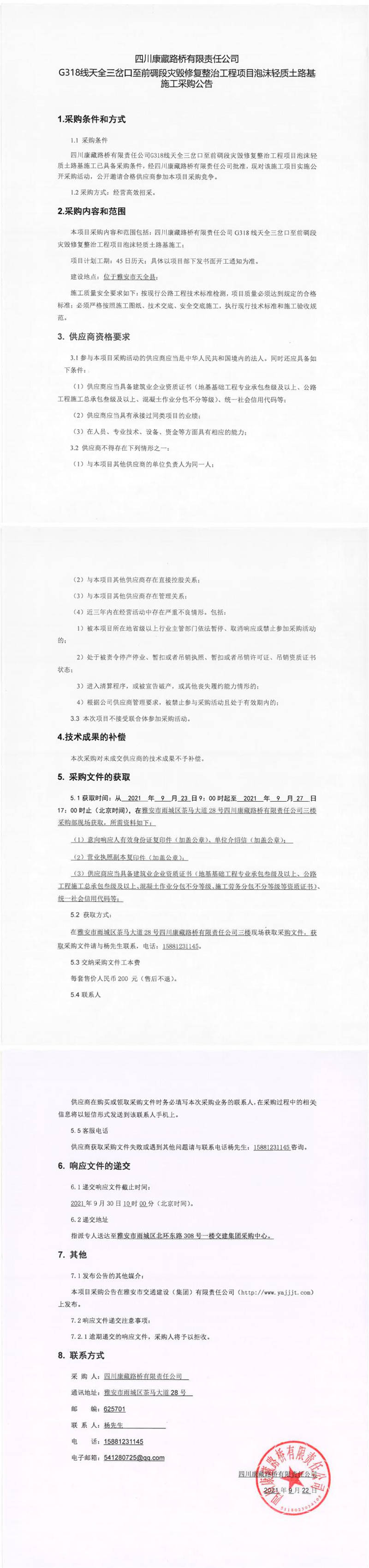 四川康藏路橋有限責(zé)任公司G318線天全三岔口至前碉段災(zāi)毀修復(fù)整治工程項(xiàng)目泡沫輕質(zhì)土路基施工采購(gòu)公告