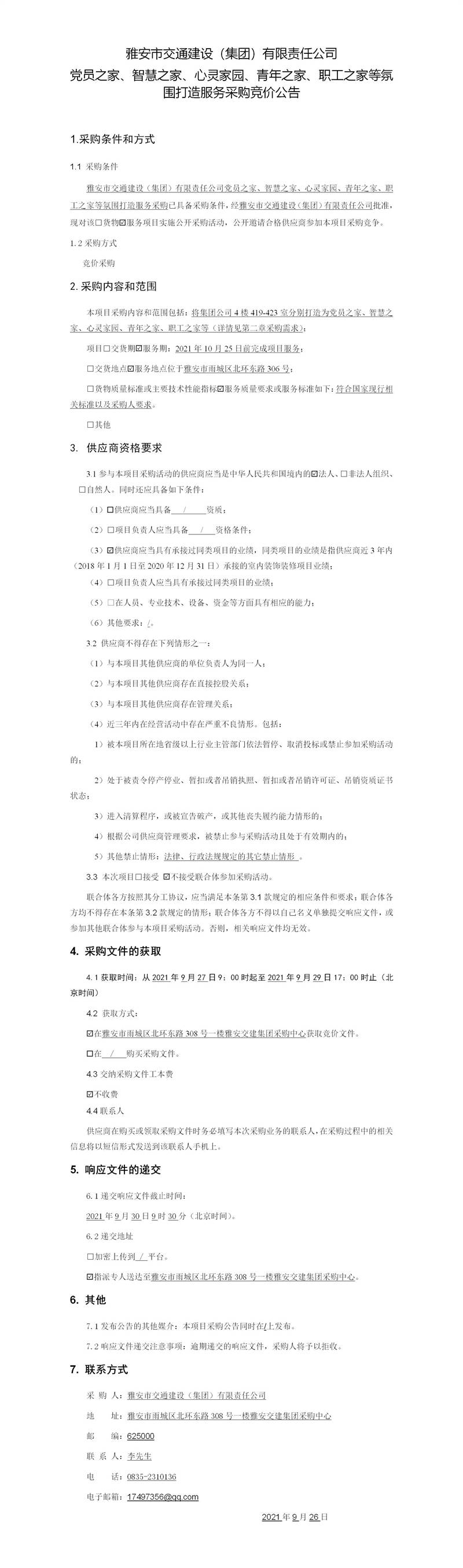 雅安市交通建設(shè)(集團(tuán))有限責(zé)任公司黨員之家、智慧之家、心靈家園、青年之家、職工之家等氛圍打造服務(wù)采購競價(jià)公告
