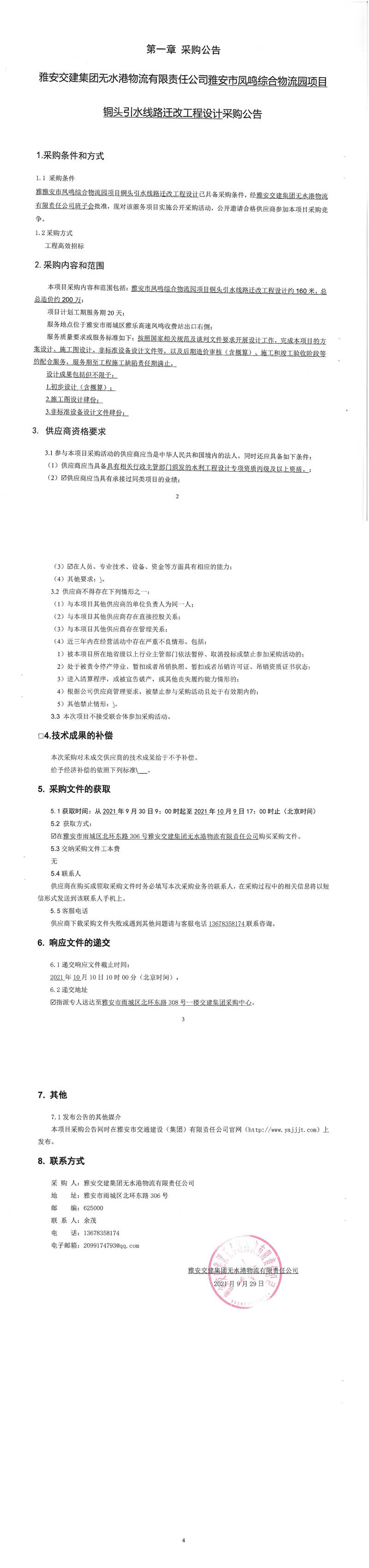 雅安交建集團無水港物流有限責任公司雅安市鳳鳴綜合物流園項目銅頭引水線路遷改工程設(shè)計采購公告