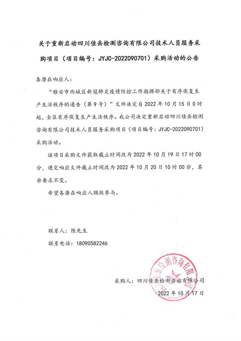 四川佳岳檢測(cè)咨詢(xún)有限公司關(guān)于重新啟動(dòng)四川佳岳檢測(cè)咨詢(xún)有限公司技術(shù)人員服務(wù)采購(gòu)項(xiàng)目(項(xiàng)目編號(hào):JYJC-2022090701)采購(gòu)活動(dòng)的公告