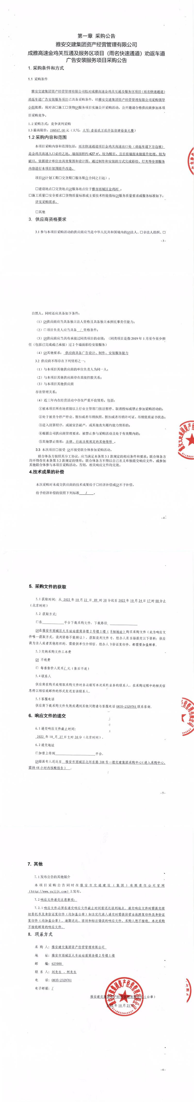 雅安交建集團(tuán)資產(chǎn)經(jīng)營(yíng)管理有限公司成雅高速金雞關(guān)互通及服務(wù)區(qū)項(xiàng)目(雨名快速通道)勸返車道廣告安裝服務(wù)項(xiàng)目采購(gòu)公告