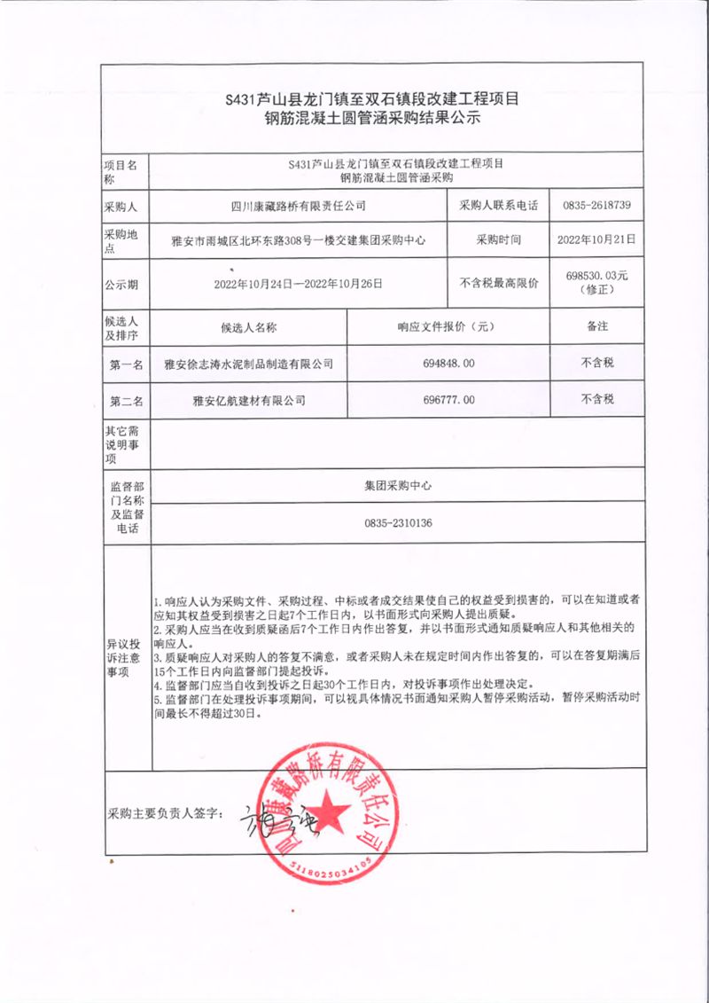 四川康藏路橋有限責任公司S431蘆山縣龍門鎮(zhèn)至雙石鎮(zhèn)段改建工程項目鋼筋混凝土圓管涵采購結(jié)果公示