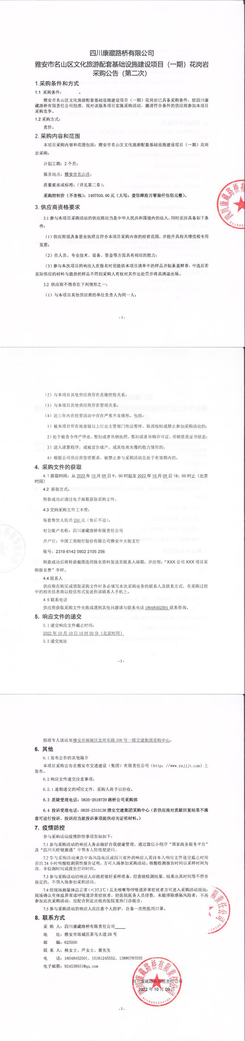 四川康藏路橋有限責(zé)任公司雅安市名山區(qū)文化旅游配套基礎(chǔ)設(shè)施建設(shè)項(xiàng)目(一期)花崗巖采購公告(第二次)