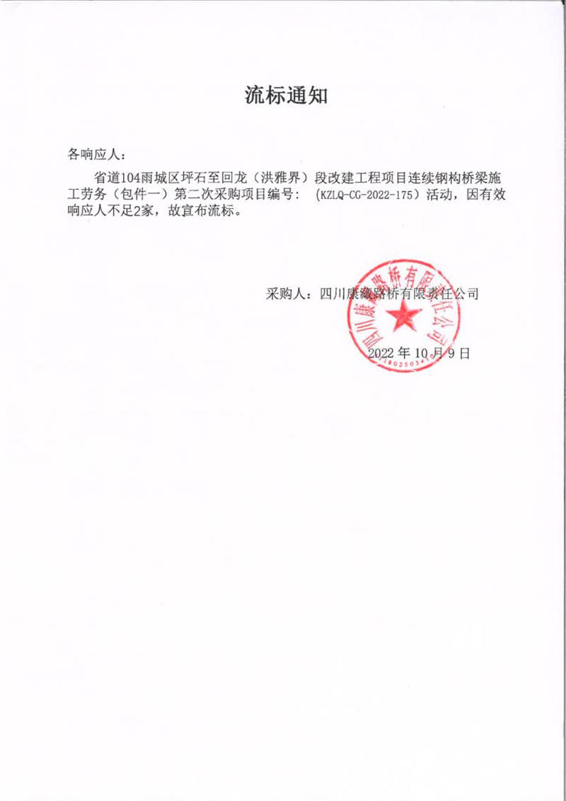 四川康藏路橋有限責(zé)任公司省道104雨城區(qū)坪石至回龍(洪雅界)段改建工程項目連續(xù)鋼構(gòu)橋梁施工勞務(wù)(包件一)第二次采購項目流標通知