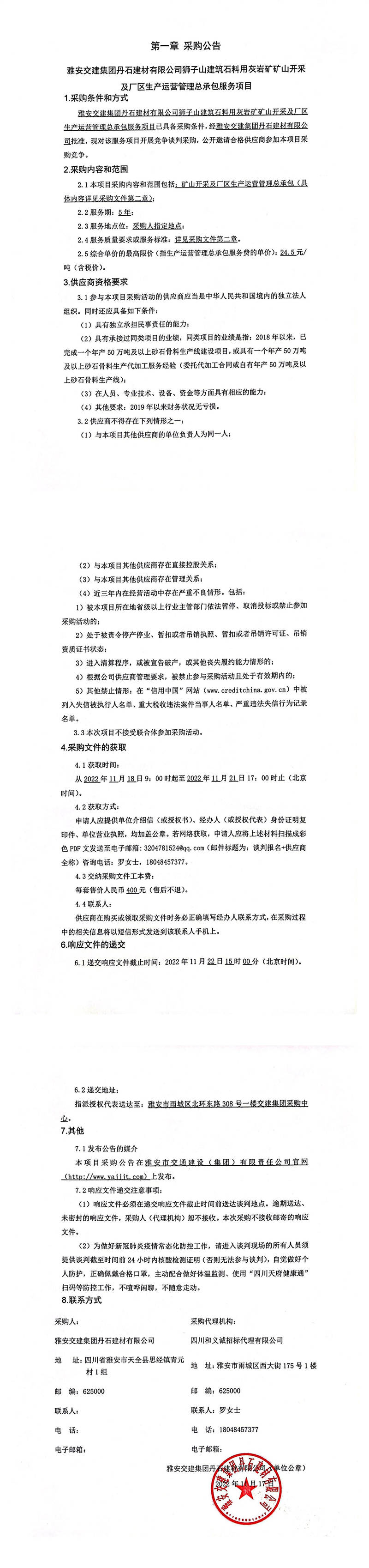 雅安交建集團(tuán)丹石建材有限公司獅子山建筑石料用灰?guī)r礦礦山開(kāi)采及廠區(qū)生產(chǎn)運(yùn)營(yíng)管理總承包服務(wù)項(xiàng)目采購(gòu)公告