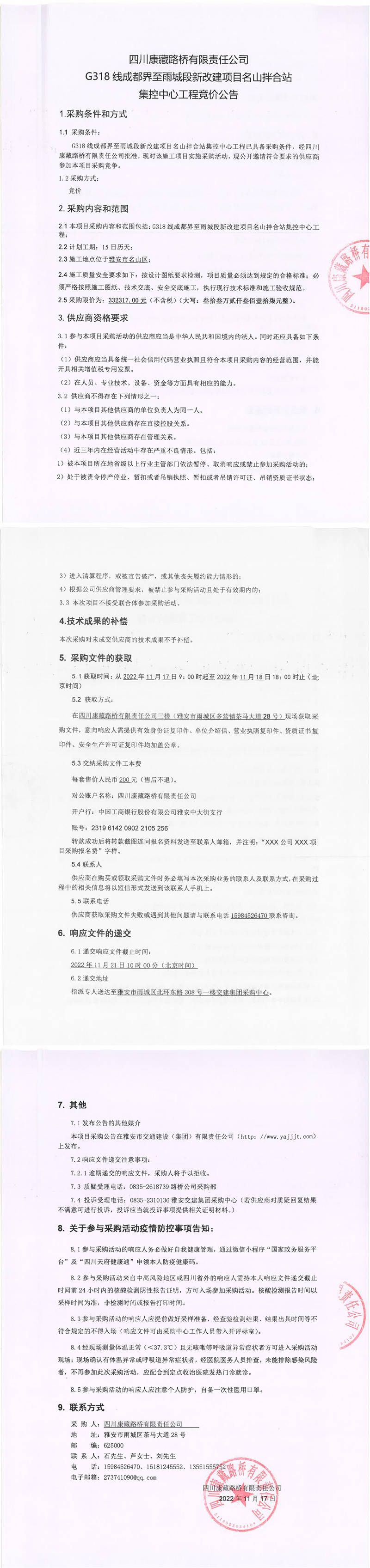 四川康藏路橋有限責(zé)任公司G318線成都界至雨城段新改建項目名山拌合站集控中心工程競價公告
