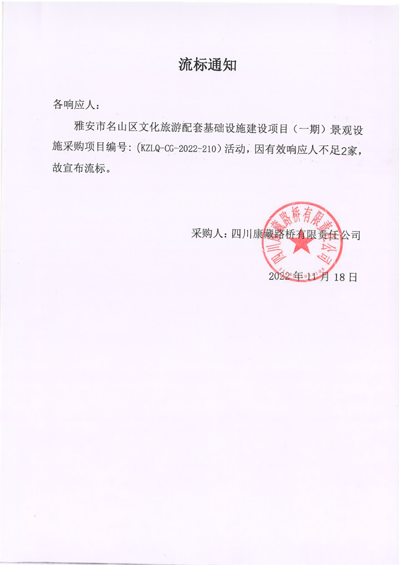 四川康藏路橋有限責(zé)任公司雅安市名山區(qū)文化旅游配套基礎(chǔ)設(shè)施建設(shè)項目(一期)景觀設(shè)施采購項目流標通知