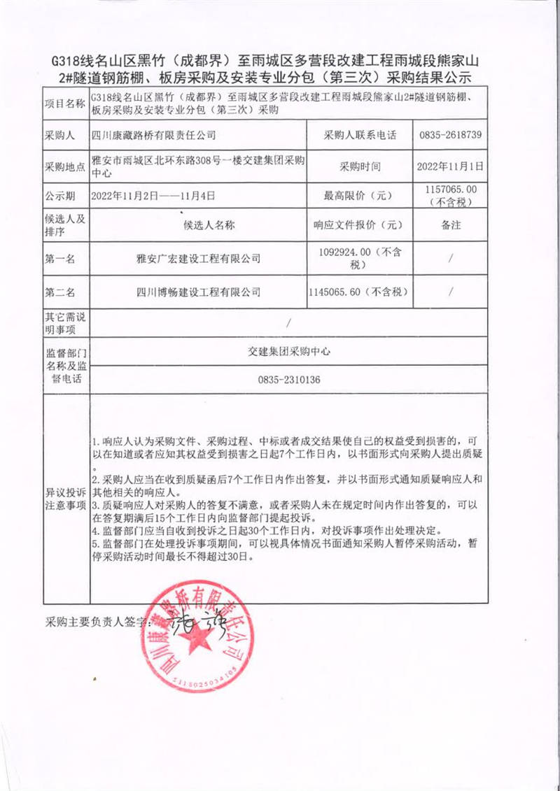 四川康藏路橋有限責(zé)任公司G318線(xiàn)名山區(qū)黑竹(成都界)至雨城區(qū)多營(yíng)段改建工程雨城段熊家山2#隧道鋼筋棚、板房采購(gòu)及安裝專(zhuān)業(yè)分包(第三次)采購(gòu)結(jié)果公示