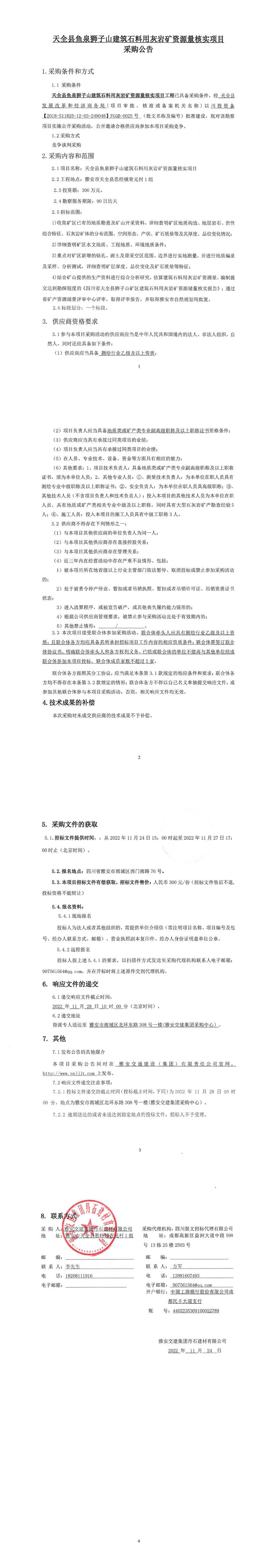 雅安交建集團(tuán)丹石建材有限公司天全縣魚泉獅子山建筑石料用灰?guī)r礦資源量核實(shí)項(xiàng)目采購(gòu)公告