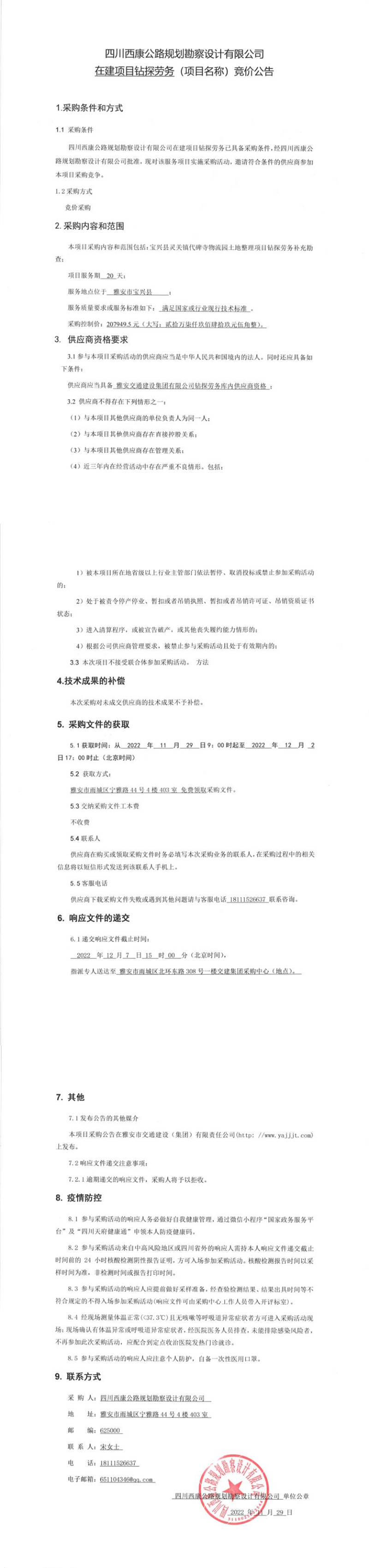 四川西康公路規(guī)劃勘察設(shè)計(jì)有限公司在建項(xiàng)目鉆探勞務(wù)競(jìng)價(jià)公告