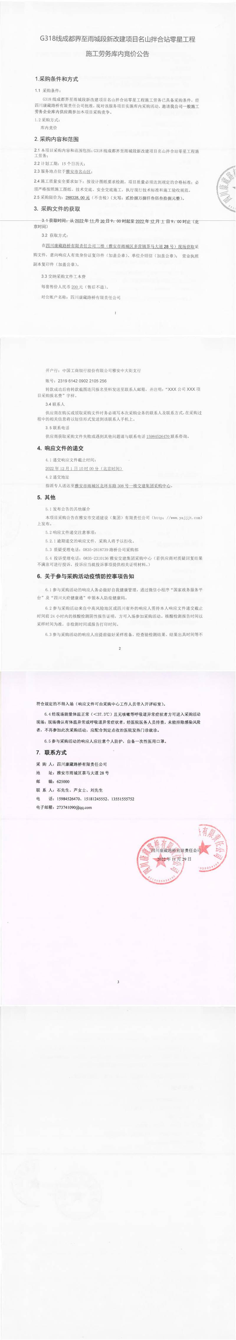 四川康藏路橋有限責(zé)任公司G318線成都界至雨城段新改建項(xiàng)目名山拌合站零星工程施工勞務(wù)庫內(nèi)競(jìng)價(jià)公告