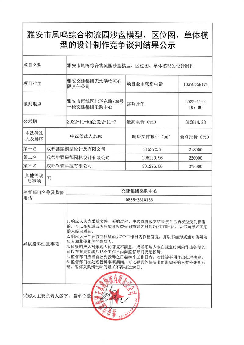 雅安交建集團(tuán)無水港物流有限責(zé)任公司雅安市鳳鳴綜合物流園沙盤模型、區(qū)位圖、單體模型的設(shè)計(jì)制作競(jìng)爭(zhēng)談判結(jié)果公示