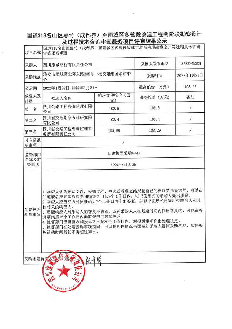 四川康藏路橋有限責(zé)任公司國道318名山區(qū)黑竹(成都界)至雨城區(qū)多營段改建工程兩階段勘察設(shè)計(jì)及過程技術(shù)咨詢審查服務(wù)項(xiàng)目評(píng)審結(jié)果公示