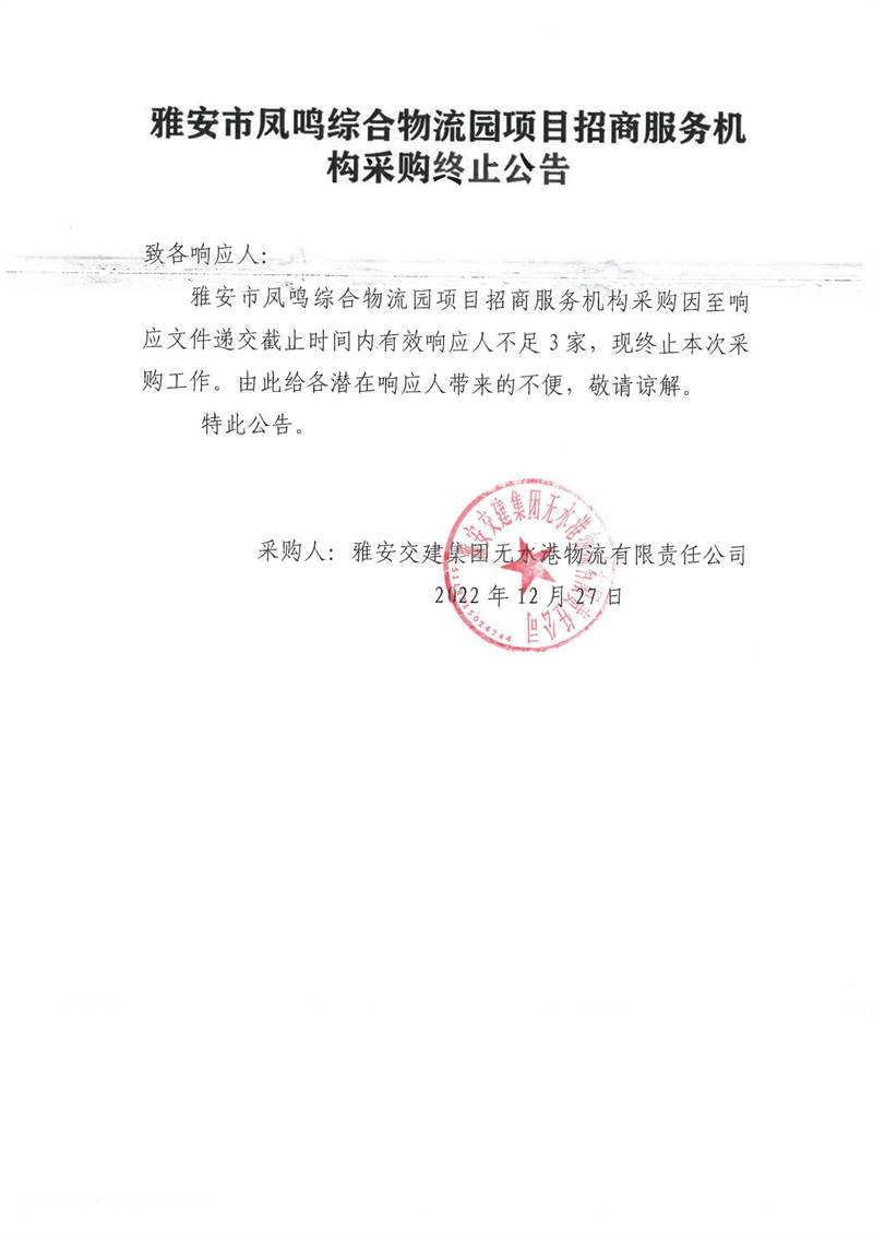雅安交建集團(tuán)無(wú)水港物流有限責(zé)任公司雅安市鳳鳴綜合物流園項(xiàng)目招商服務(wù)機(jī)構(gòu)采購(gòu)終止公告