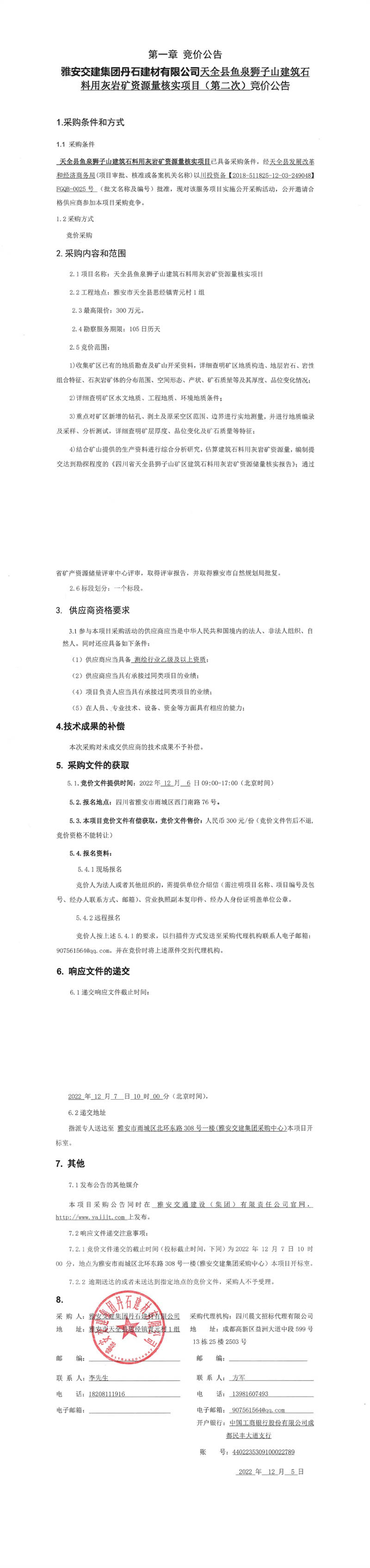 雅安交建集團(tuán)丹石建材有限公司天全縣魚泉獅子山建筑石料用灰?guī)r礦資源量核實(shí)項(xiàng)目(第二次)競(jìng)價(jià)公告