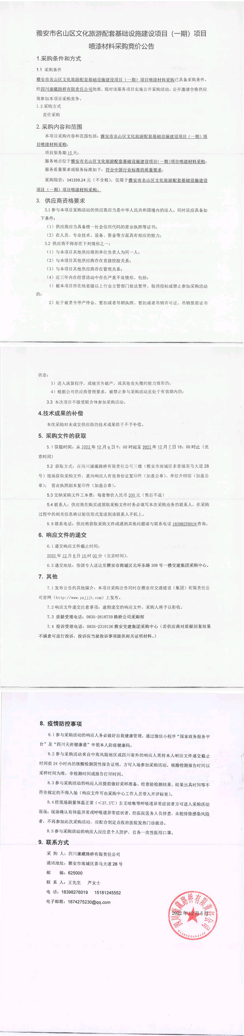 四川康藏路橋有限責(zé)任公司雅安市名山區(qū)文化旅游配套基礎(chǔ)設(shè)施建設(shè)項目(一期)項目噴漆材料采購競價公告