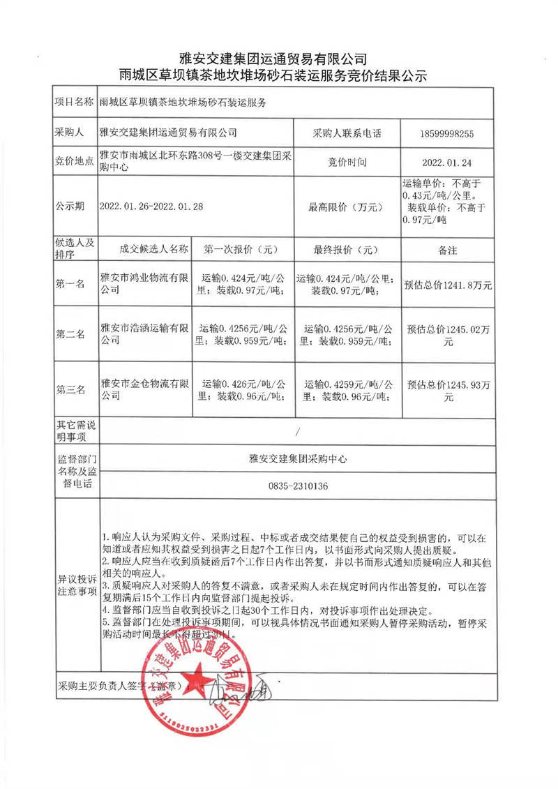 雅安交建集團運通貿(mào)易有限公司雨城區(qū)草壩鎮(zhèn)茶地坎堆場砂石裝運服務競價結(jié)果公示