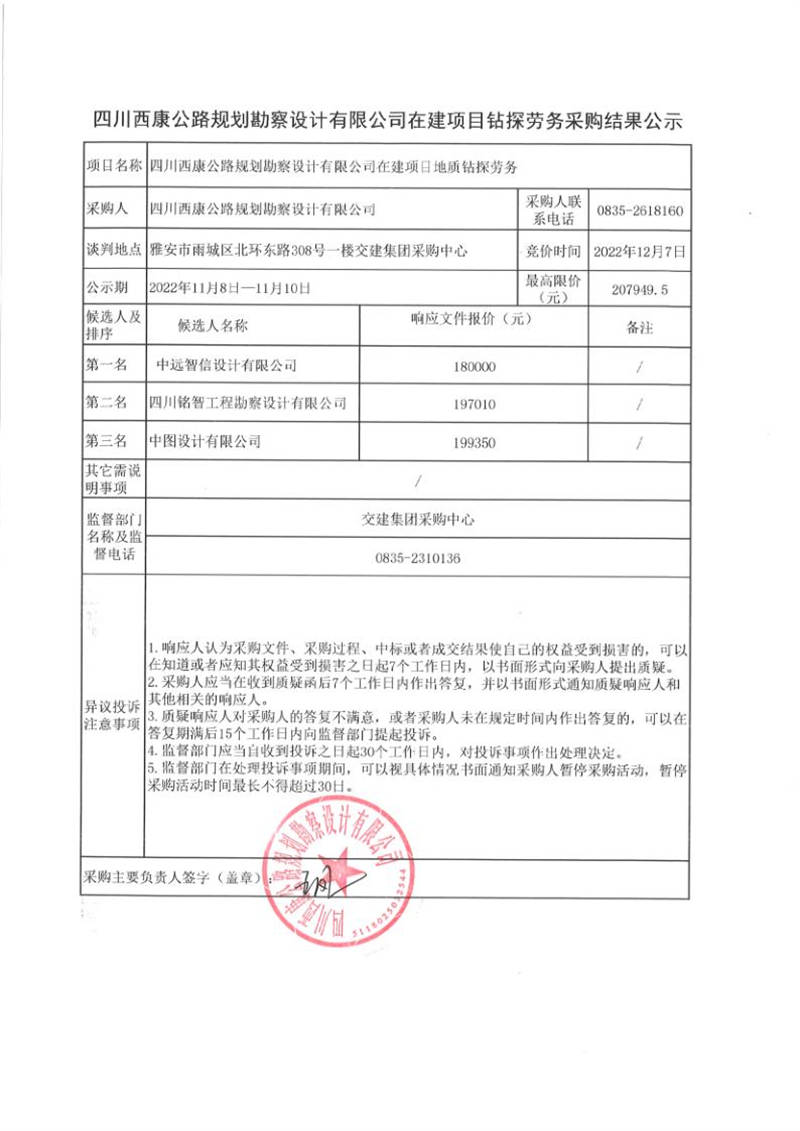 四川西康公路規(guī)劃勘察設(shè)計有限公司在建項目地質(zhì)鉆探勞務(wù)采購結(jié)果公示