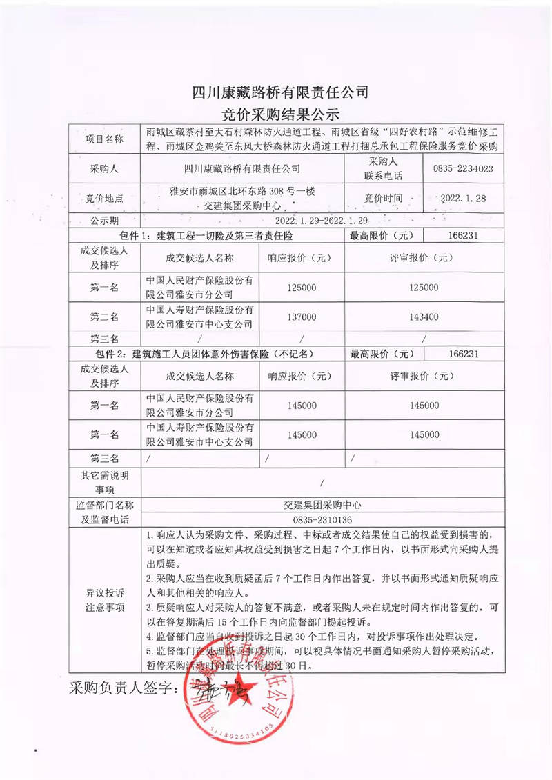 四川康藏路橋有限責任公司雨城區(qū)藏茶村至大石村森林防火通道工程、雨城區(qū)省級“四好農村路”示范維修工程、雨城區(qū)金雞關至東風大橋森林防火通道工程打捆總承包工程保險服務競價采購結果公示