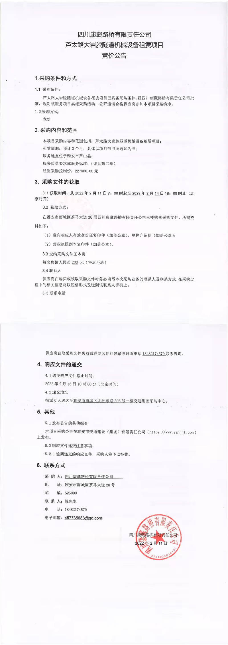 四川康藏路橋有限責(zé)任公司蘆太路大巖腔隧道機(jī)械設(shè)備租賃項(xiàng)目競價(jià)公告