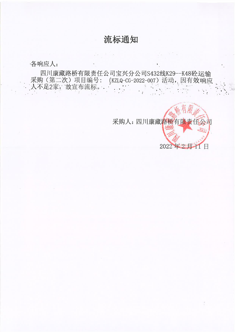 四川康藏路橋有限責任公司寶興分公司S432線K29-K48砼運輸采購(第二次)項目流標通知