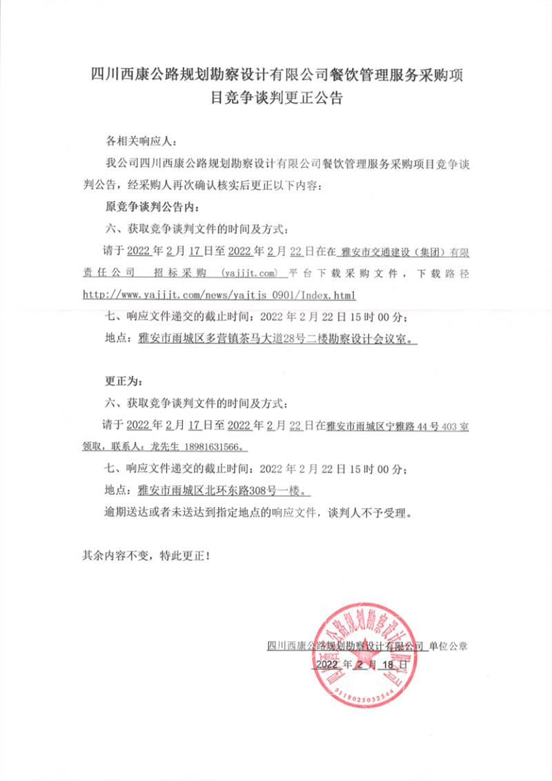 四川西康公路規(guī)劃勘察設(shè)計有限公司餐飲管理服務(wù)采購項目競爭談判更正公告