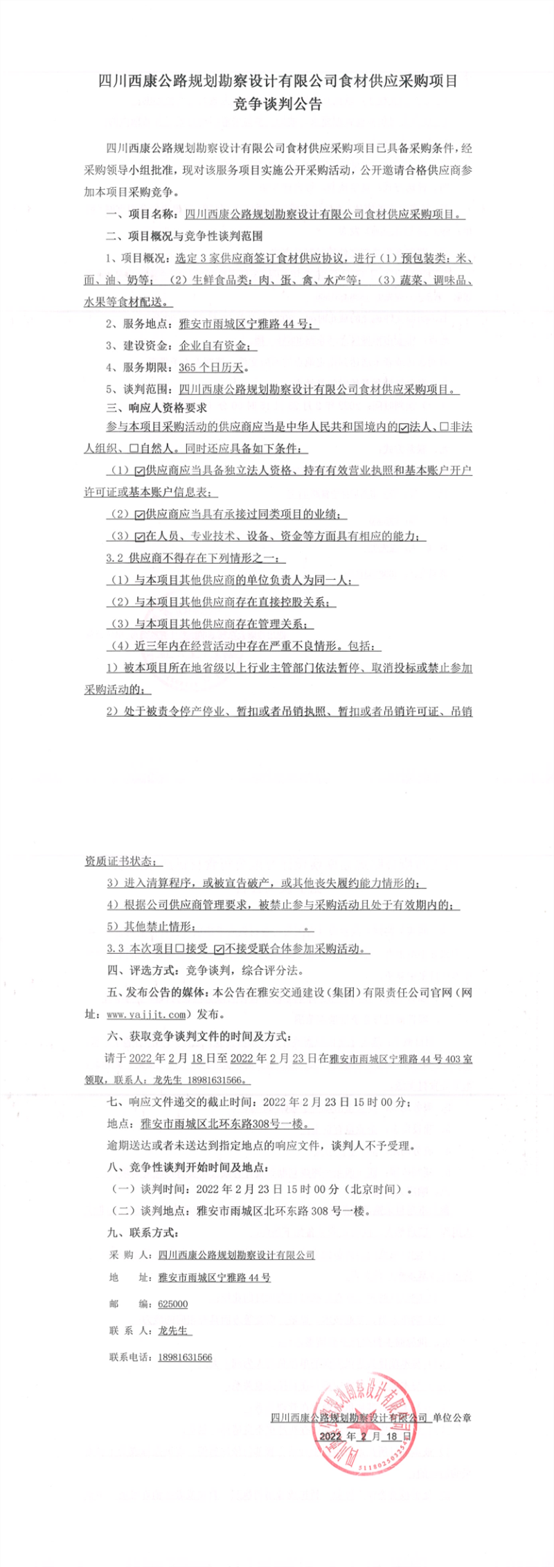 四川西康公路規(guī)劃勘察設(shè)計(jì)有限公司食材供應(yīng)采購(gòu)項(xiàng)目競(jìng)爭(zhēng)談判公告