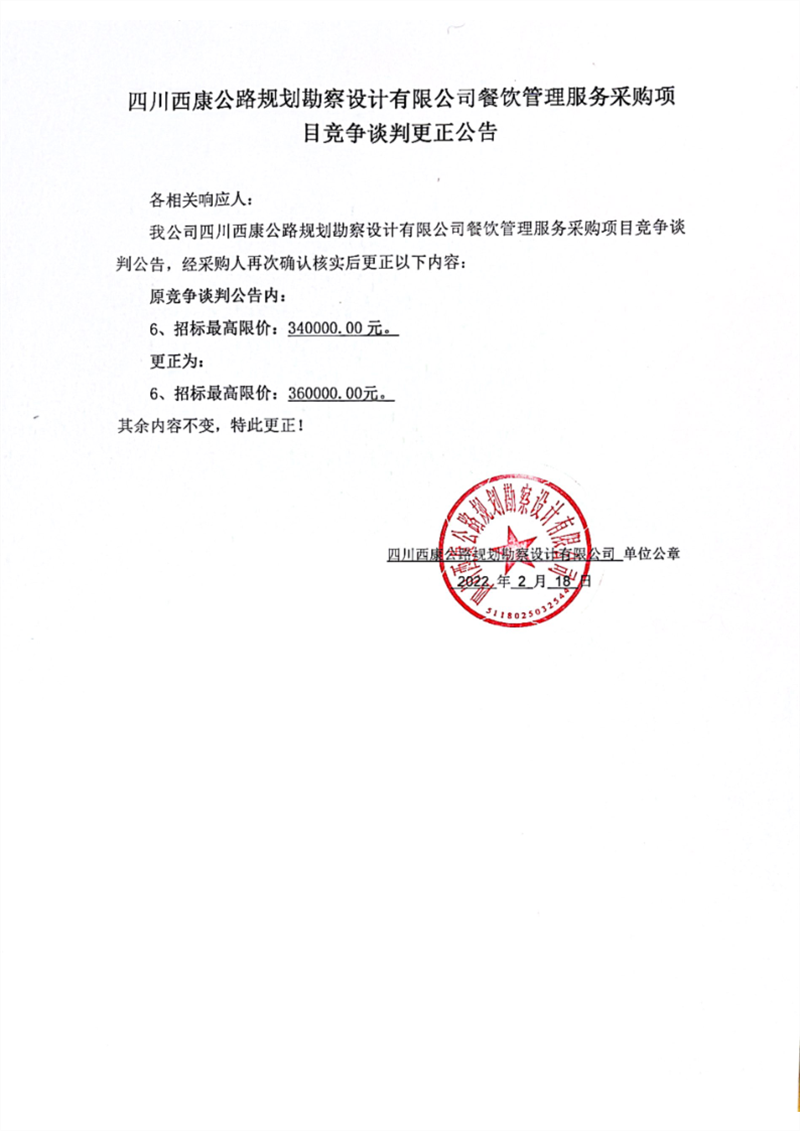 四川西康公路規(guī)劃勘察設(shè)計有限公司餐飲管理服務(wù)采購項目競爭談判更正公告(第二次)