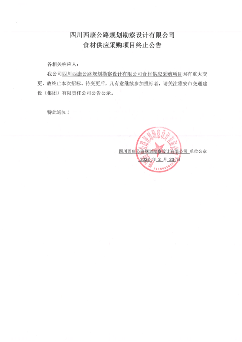 四川西康公路規(guī)劃勘察設計有限公司食材供應采購項目終止公告