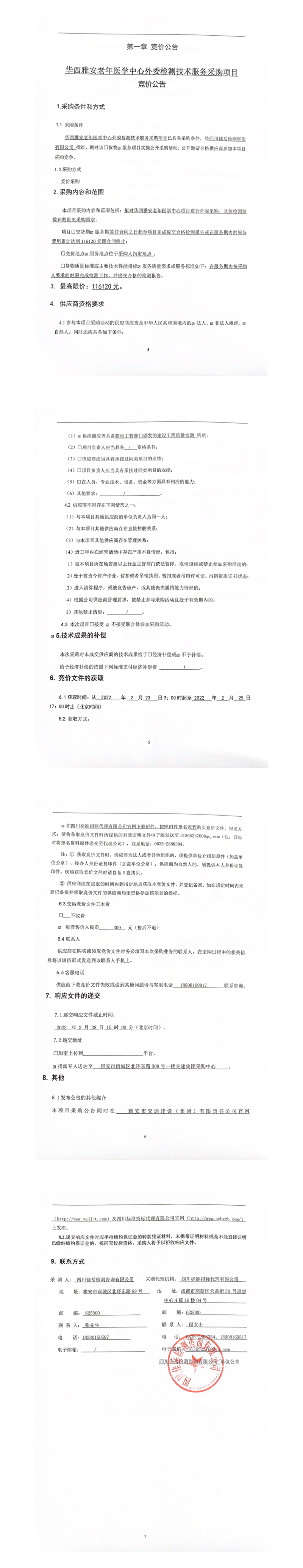 四川佳岳檢測咨詢有限公司華西雅安老年醫(yī)學(xué)中心外委檢測技術(shù)服務(wù)采購項(xiàng)目競價(jià)公告