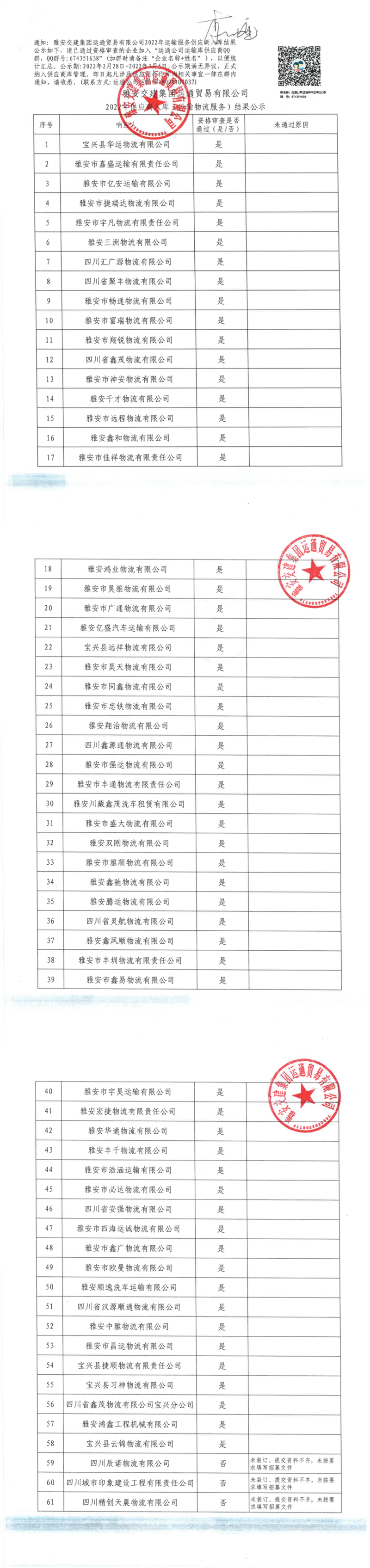 雅安交建集團運通貿(mào)易有限公司2022年供應(yīng)商入庫(運輸物流服務(wù))結(jié)果公示