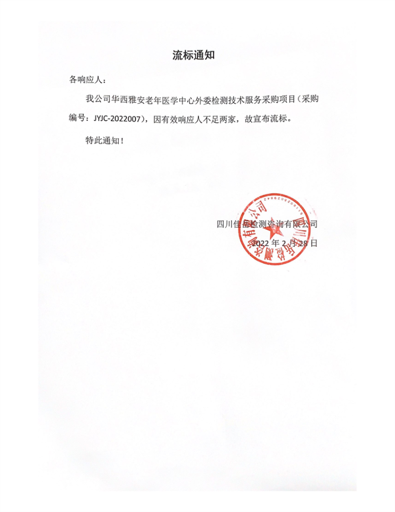 四川佳岳檢測咨詢有限公司華西雅安老年醫(yī)學中心外委檢測技術服務采購項目流標通知