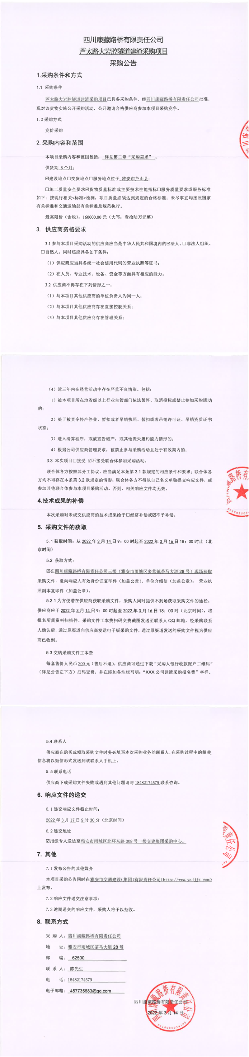 四川康藏路橋有限責(zé)任公司蘆太路大巖腔隧道建渣采購項(xiàng)目采購公告