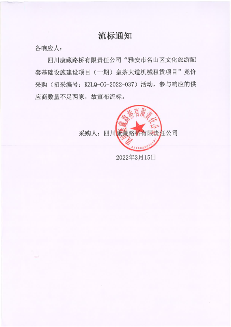 四川康藏路橋有限責(zé)任公司雅安市名山區(qū)文化旅游配套基礎(chǔ)設(shè)施建設(shè)項目(一期)皇茶大道機械租賃項目流標通知
