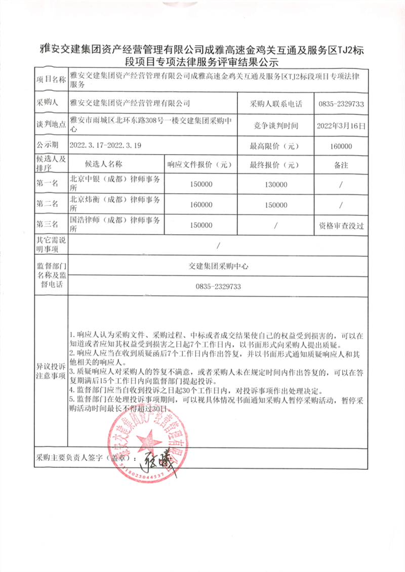 雅安交建集團(tuán)資產(chǎn)經(jīng)營管理有限公司成雅高速金雞關(guān)互通及服務(wù)區(qū)TJ2標(biāo)段項目專項法律服務(wù)評審結(jié)果公示