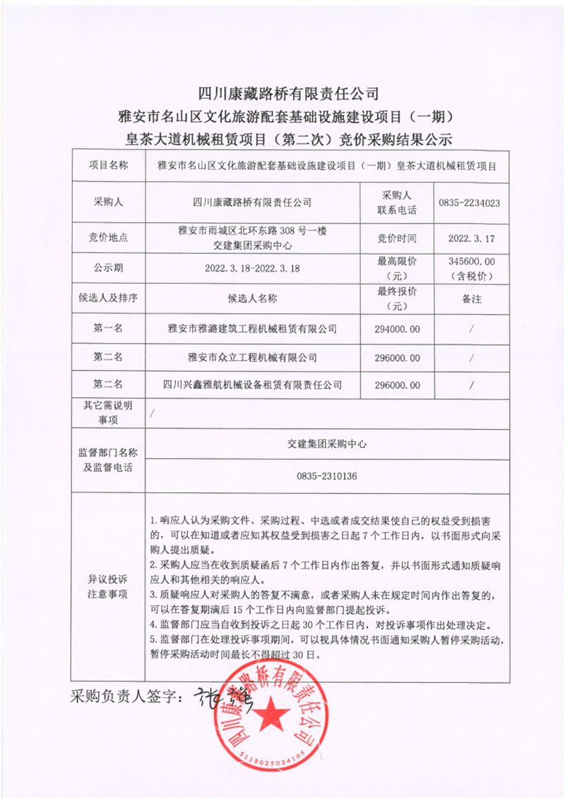 四川康藏路橋有限責(zé)任公司雅安市名山區(qū)文化旅游配套基礎(chǔ)設(shè)施建設(shè)項(xiàng)目(一期)皇茶大道機(jī)械租賃項(xiàng)目(第二次)競(jìng)價(jià)采購(gòu)結(jié)果公示