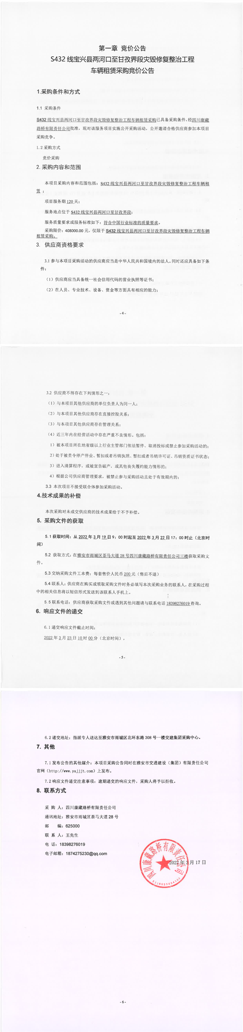 四川康藏路橋有限責(zé)任公司S432線寶興縣兩河口至甘孜界段災(zāi)毀修復(fù)整治工程車輛租賃采購競(jìng)價(jià)公告
