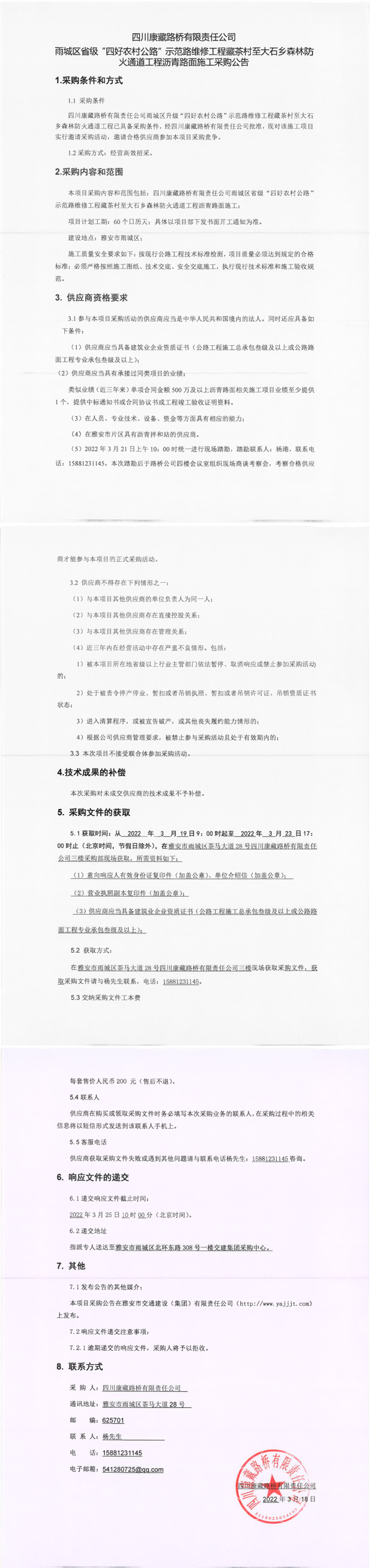 四川康藏路橋有限責任公司雨城區(qū)省級“四好農村公路”示范路維修工程藏茶村至大石鄉(xiāng)森林防火通道工程瀝青路面施工采購公告