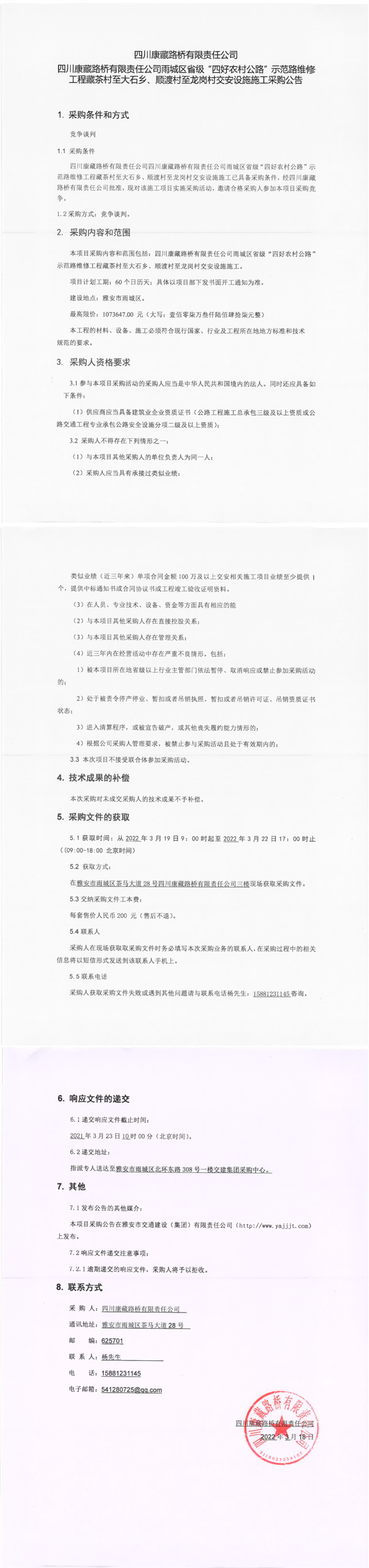 四川康藏路橋有限責(zé)任公司雨城區(qū)省級“四好農(nóng)村公路”示范路維修工程藏茶村至大石鄉(xiāng)、順渡村至龍崗村交安設(shè)施施工采購公告