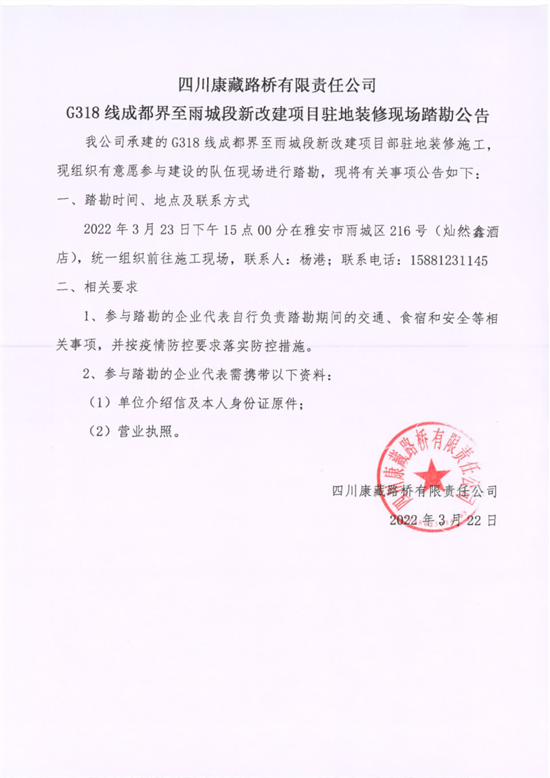 四川康藏路橋有限責任公司G318線成都界至雨城段新改建項目駐地裝修現(xiàn)場踏勘公告