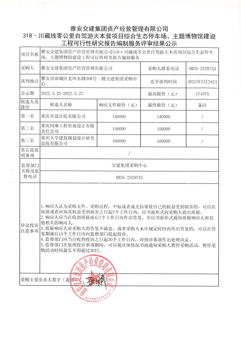 雅安交建集團資產(chǎn)經(jīng)營管理有限公司318.川藏線零公里自駕游大本營項目綜合生態(tài)停車場、主題博物館建設(shè)工程可行性研究報告編制服務(wù)評審結(jié)果公示