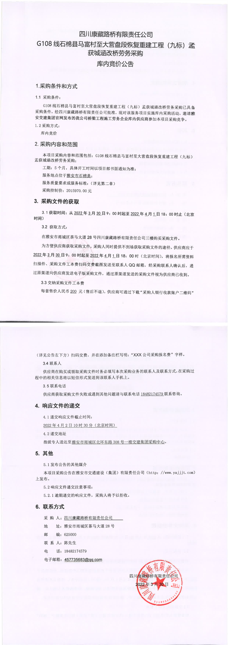 四川康藏路橋有限責任公司G108線石棉縣馬富村至大營盤段恢復重建工程(九標)孟獲城涵改橋勞務采購庫內(nèi)競價公告